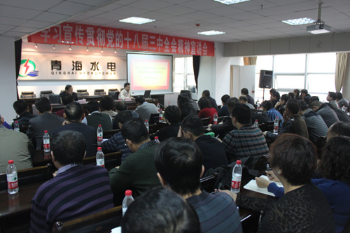 125上午,青海水電集團召開學習宣傳貫徹黨的十八屆三中全會精神宣講會。省委講師團團長郭云甫同志作宣講報告。集團黨委書記、董事長唐增科同志主持宣講會,總經理王海青和集團班子其他成員李傳強、吳世周、徐強、李建民、姚鐵兵同志,各成員企業在寧的負責同志和黨群部門負責人、黨員代表,以及集團本部機關干部職工共70余人聆聽宣講。